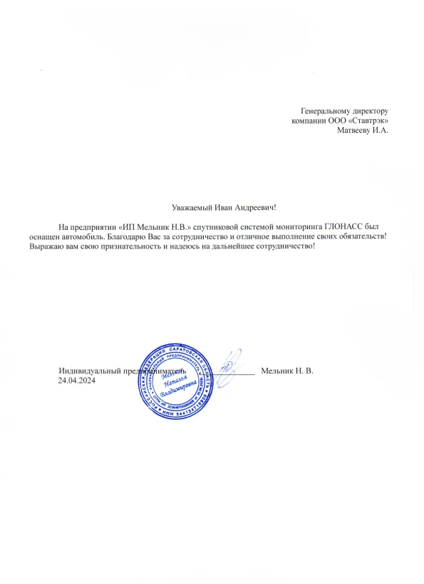 Выражаем благодарность компании «Ставтрэк» за качественную установку спутниковой системы мониторинга ГЛОНАСС на наш автомобиль. Работой остались полностью довольны и надеемся на дальнейшее плодотворное сотрудничество!